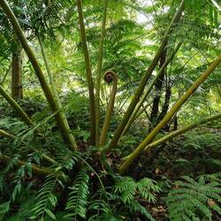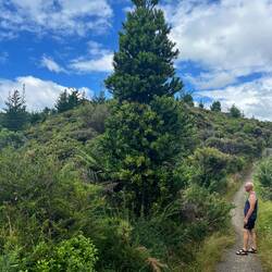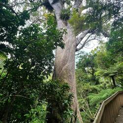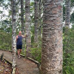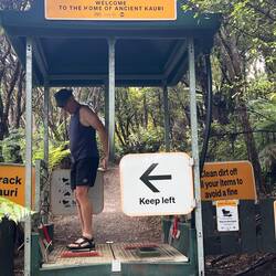Auf dem Rückweg durchqueren wir das kleine Reservat „Kauri Block“. Erneut müssen wir unsere Schuhe desinfizieren beim Ein- und beim Ausgang. Wir können einige bereits grössere Kauribäume bewundern, man erkennt sie sofort an ihren geraden leicht gesprenkelten Stämmen. Und dann kommen wir noch an einem sehr alten Riesenbaum vorbei, der wahrscheinlich stehen gelassen wurde vor zweihundert Jahren, weil er ausnahmsweise nicht ganz gerade gewachsen ist. Vor ungefähr zwanzig Jahren wurden in diesem Reservat viele junge Kauri gepflanzt. Diese Bäume zeigen ein ganz anderes Bild - sie ähneln eher grossen Weihnachtsbäumen.