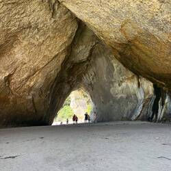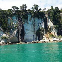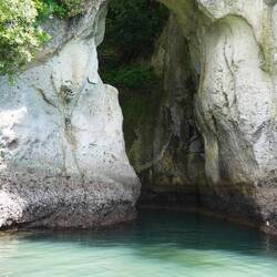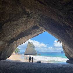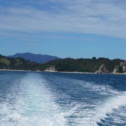 Am Freitag fahren wir in den nächsten grösseren Ort, nach Whitiangi und fahren von dort aus mit einem Glasbodenboot der Küste entlang. Wir können viele interessante Felsformationen vom Meer aus anschauen, kleine Buchten, eine Wasserhöhle und als berühmtesten Ort die „Cathedral Cave“, ein Torbogen aus Fels. Wir fahren auch vorbei an Seegrasbänken und Felsennasen, wo sich Fischschwärme aufhalten. Dank dem Glasboden im Boot können wir diese ausgiebig bewundern. Ganz kurz haben wir die Gelegenheit, zu Schnorcheln und die Fische unmittelbar zu beobachten.