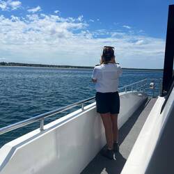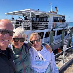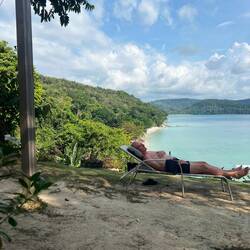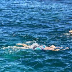 Am Dienstag wandern wir ein Stück der Küste entlang und schwimmen im klaren Wasser, damit sind wir dann erholt und gut gerüstet für die Schifffahrt zum Delphine beobachten. Die Fahrt hinaus in den Bay ist sehr entspannend, allerdings sind wir aufgefordert, das Meer zu beobachten, damit wir die Delphine nicht verpassen. Auch das Bootspersonal beobachtet mit dem Feldstecher, währenddem wir die grosse Bucht umrunden. Bei 90% der Fahrten würden sie Delphine entdecken, meint der Kapitän - wir gehören leider zu den 10%, die keine sehen😟. Draussen auf der anderen Seite der Bucht gibt es noch eine zusätzliche Attraktion, die wir nicht gebucht haben: Man kann hinter dem Schiff in ein Netz sitzen und das Sprudeln des Wasser geniessen, wenn das Boot langsam fährt („Boom-Netting“).