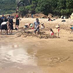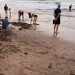 An der Hotwater Beach gibt es eine Stelle, wo heisses Thermalwasser durch den Sand herausrinnt. Diese Stelle ist aber nur bei Ebbe sicht- und erreichbar, man muss also den Gezeitenkalender genau anschauen. Wir sind am Abend beim Eindunkeln am Strand und können beobachten, wie die Leute Löcher buddeln, um darin das austretende warme Wasser zu sammeln und ein Thermalbad zu nehmen.