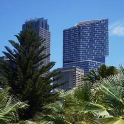 Am späteren Nachmittag fahren wir mit der Fähre nach Barangaroo, das ist der neuste Stadtteil, der erst vor einem Jahr fertig gestellt wurde. Hier musste eine Grünfläche mit Spielfeldern für verschiedene Sportarten weichen für die Stadtentwicklung. Nun ist nur sehr wenig Grün zwischen den Häusern zu sehen, es überwiegen die kalten und unpersönlichen Materialien wie Glas und Beton.