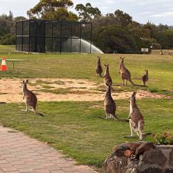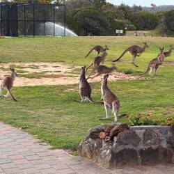 Auf der Heimkehr zum Campingplatz fahren wir noch beim Golfplatz vorbei und können dort sicher 30 - 40 Känguruhs sichten - ein sehr überraschender Anblick.