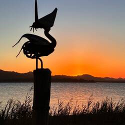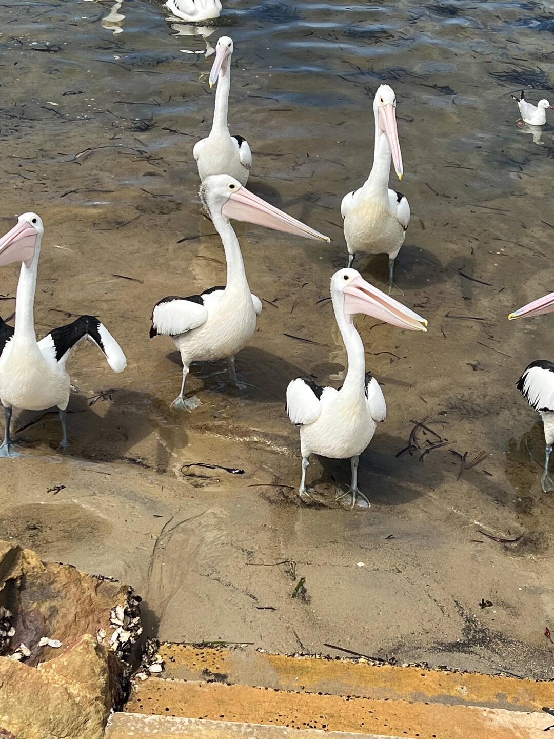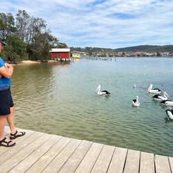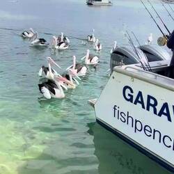 An der Spitze der Pambula Beach legt ein kleines Schiff an, das vom Fischen kommt. Sofort herrscht ein reges Treiben von heranfliegenden Pelikanen, die hier überall anzutreffen sind. Und sie kommen nicht ohne Grund, denn die Fischer filetieren die gefangenen Fische gleich auf dem Boot und werfen den Abfall über Bord. Sogleich schnappen alle Pelikane nach der Beute, und der schnellste erwischt den Fisch. Sofort verschwindet der Fang im Beutel unterhalb des Schnabels und wird danach mit hochgezogenem Kopf in den Rachen befördert.