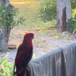 Am nächsten Morgen sitzt plötzlich ein „Rosella“ auf dem Stuhl vor unserem Eingang und fordert lautstark Futter. Weil wir nur beobachten und keine Kerne bereitstellen, fliegt dieser Vogel sogar an unser Fliegengitter und wird noch eindringlicher. Schliesslich macht er sich davon, wir öffnen die Eingangstüre und stellen die gewünschten Samen bereit.