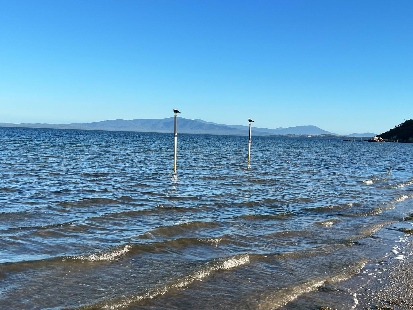 Dank unserer Freundin Marg aus Australien können wir mit ihr zusammen in einem Haus der Mitarbeitenden vom Nationalpark Wilsons Promontory in Yanakie übernachten. Es ist eine Übergangsbehausung etwas ausserhalb des Parks, die im Moment nur von einer Bekannten der Familie genutzt wird. Wir richten uns dort ein und schauen uns den Strand beim Eingang der Halbinsel auf der Ostseite an. Dort im geschützten Bereich des Bays ist das Wasser sehr ruhig und ein bisschen trüb.