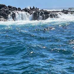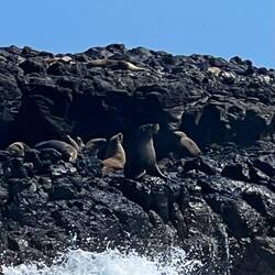 Am Montagnachmittag machen wir eine Schiffstour bis zu den Felsen etwas ausserhalb von den Pinguinfelsen, zu den „Nobbies“. Dort draussen befindet sich eine riesige Kolonie Seebären. So viele zusammen haben wir in Neuseeland nie gesehen. Die Jungtiere über das Schwimmen im Wasser, sie springen und tauchen wie wild im unruhigen Wasser, denn hier prallen mächtige Wellen auf die Felsen.