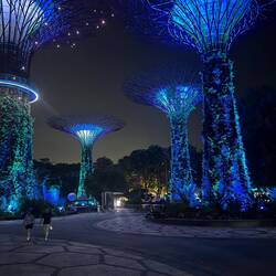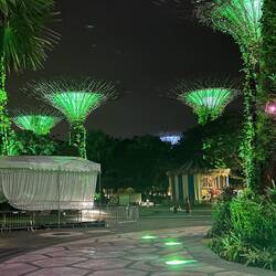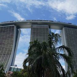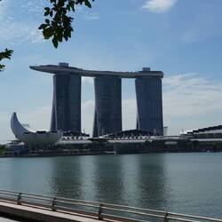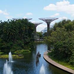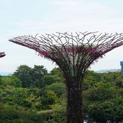 Gegen Mittag wird es wirklich sehr heiss, und wir erleben nun die für Singapur bekannte Temperatur hautnah. Trotzdem wandern wir weiter Richtung Meer und besuchen weitere bekannte Orte, die sich auf dem aufgeschütteten Land ausserhalb der ursprünglichen Bucht befinden. Einerseits das Marina Bay Sands Hotel - ein Hochhaus, das aussieht wie ein Schiff über den Wellen und andererseits den „Garden of the Bay“, künstlich angelegte Gärten mit hohen Skulpturen, die aussehen wie grosse Blüten.