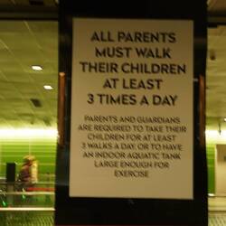 Als wir durch die Ausstellung streifen, begegnet uns eine Gruppe Kinder, wahrscheinlich ein Kindergarten. Die Kinder wirken sehr brav und wohlerzogen. Sie verstehen wahrscheinlich wenig von dem Gezeigten, aber sie verhalten sich alle anständig und ruhig. Bezüglich der Kindererziehung hat der Staat anscheinend ziemlich mitzureden, uns ist ein Plakat aufgefallen in der Untergrundbahn, das die Eltern anweist, mindestens 3 Mal im Tag mit den Kindern laufen zu gehen.