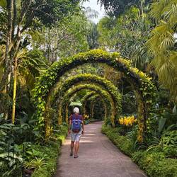 Rund um die grossen Bäume wurde eine Schicht mit Bodendecker gelegt, und dann wird dieser Kreis sogar noch eingezäunt. Der Orchideen-Garten ist mit den unterschiedlichsten Arten gestaltet, viele wurden wahrscheinlich vor Kurzem eingesetzt, denn sie blühen alle gleichzeitig, es gibt kaum dürre Blätter oder überlange Luftwurzeln. Es ist höchst beeindruckend, welcher Aufwand hier geleistet wird. Der gesamte botanische Garten wirkt sehr grün und gesund - es fehlen einfach die Vögel, so wie wir es von Neuseeland und Australien gewohnt sind. Wir fragen uns, ob hier die Nahrungsgrundlage fehlt. „Die wenden zu viel Unkrautvertilger an“, meint Toni. Schliesslich begegnen wir doch noch einigen wilden Tieren.
