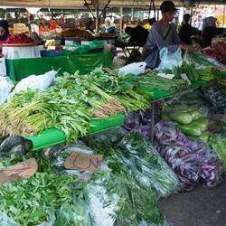 Kota Kinabalu ist die Hauptstadt vom Bezirk Sabah, sie ist bekannt für die grossen Märkte mit Fischen, Gemüse und Strassenküchen. Auf unserem Stadtbummel werden wir richtiggehend überrannt mit Angeboten. Es wird in grossen Töpfen gekocht und dann nach Wunsch abgemessen und ins gewünschte Gefäss abgefüllt. Wir kennen die Speisen natürlich alle nicht, aber es sieht farbig und vielfältig aus, was da gekocht wird. Viele Händler in der Nähe des Hafens bieten Fisch und Meerestiere an, zum Teil könnte man diese auch gleich kochen lassen. Für unser Hygienegefühl ist diese Fülle an verderblichen Frischwaren direkt vor den vorbeiziehenden Passanten und nahe vom Strassenverkehr doch etwas bedenklich. Wir verköstigen uns deshalb später in einem Restaurant mit einheimischen Speisen (Fisch und Schwein mit Reis und Ceylonspinat). Der Lebensstandard hier ist deutlich tiefer als in Singapur, vereinzelt sehen wir bettelnde Kinder und Menschen auf der Strasse.