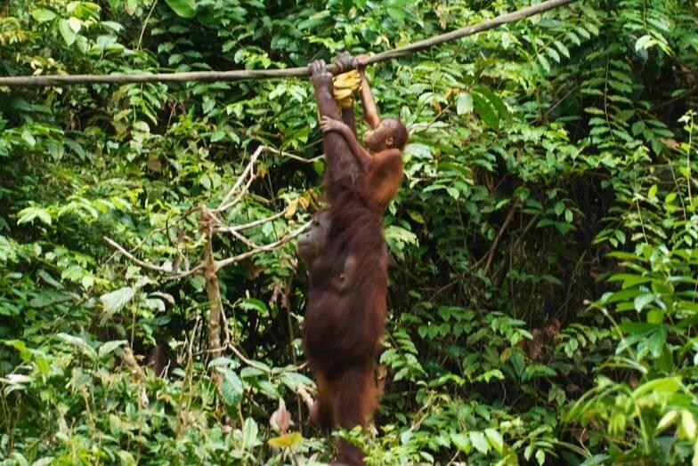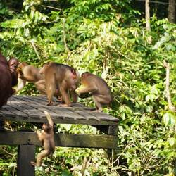 Wir beobachten die eindrücklichen Orang-Utan, deren Gebaren und die Machtspielchen mit den frechen Makaken. Wir erfahren, dass Orang-Utan einzeln unterwegs sind, meistens ein Weibchen mit einem Jungen und eventuell einem zweiten älteren, d.h. Früher geborenen Kind. Die Männchen leben etwas unabhängiger. In der Wldnis ist es äussert schwierig, Orang-Utan zu beobachten, da sie hoch oben in den Bäumen leben und ständig unterwegs sind. Sie machen jeden Tag ein neues Nest zum Übernachten, jedes Tier einzeln, wobei sich das Nest der Jungtiere in der Nähe der Mutter befindet.