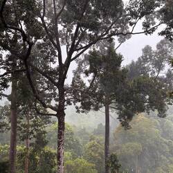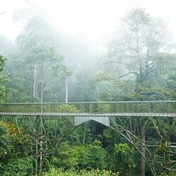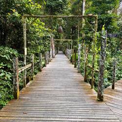 Wir fahren auf dem gleichen Wasserweg zurück nach Sandakan und dann zum Rainforest Discovery Center. Dort kann man von einem „Baumwipfelpfad“ aus die Tiere direkt in den Bäumen beobachten. Als wir dort ankommen, regnet es so richtig „regenwaldmässig“, und wir können lediglich die wunderbaren alten und hohen Bäume bewundern. Von weitem sehen wir noch zwei verschiedene Eichhörnchenarten und am Boden begegnen wir einer Viper, die zu den sehr giftigen Schlangen gehört.