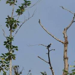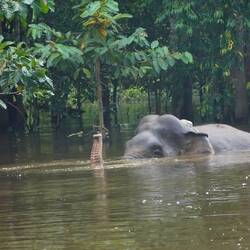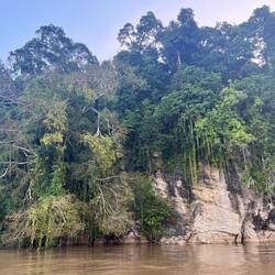Wir fahren in den drei Tagen mehrmals mit den offenen Booten durch den River Kinabatangan und durch einen Seitenarm. Wir erfahren, dass es in dieser Region „the big five of Borneo“ in der Wildnis zu beobachten gibt - wenn man Glück hat! Es sind die 5 für Borneo typischen Tiere, die alle unter einem hohen Schutz stehen: Der Orang-Utan, der Proboscis Affe (Nasenaffe), der Borneo Elefant, der Vogel „Rhinozeros Hornschnabel“ und das Salzwasser Krokodil. Unser Führer ist während unseren Ausfahrten immer am Beobachten und am Abschätzen, welche Orte zu welcher Zeit günstig sein könnten für die Beobachtung einzelner Arten. Die Vögel sehen wir vor allem am Abend. Neben dem Rhinozeros Hornschnabel gibt es noch andere eindrückliche grosse Vögel, die hoch über dem Regenwald sitzen, beobachten und dann plötzlich davon schweben. Den Orang-Utan sehen wir zufällig, er ist weit entfernt am Turnen auf einem hohen Baum.