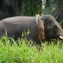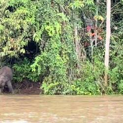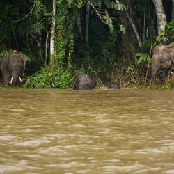 Für die Elefanten fahren wir extra früh am Nachmittag los, weil man die Erfahrung gemacht hat, dass die Herde flussabwärts zieht, und dass sie am Nachmittag am Fluss zu sehen sind. Wir kommen genau zur richtigen Zeit, und wir sind sehr beeindruckt von der Grösse der Tiere, die sich hier durch den dichten Wald vorwärts bewegen. Die Borneo Elefanten werden auch „Pygmy Elefants“ genannt, weil sie die kleinsten Elefanten sind, die es überhaupt gibt. In einem Seitenarm treffen wir dann unvermutet auf den Elefantenbullen, der gerade durch den Fluss schwimmt. Das ist der Leitbulle, der jeweils vor der Herde das Revier erkundet.