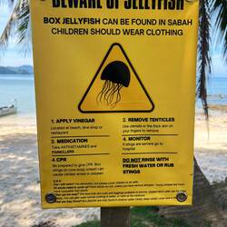 Am Freitag erkunden wir den Strand, schwimmen im flachen Wasser und beobachten die anderen Gäste bei ihren Aktivitäten. Fast alle, die ins Wasser gehen, tragen lange Kleider, denn es besteht die Gefahr von giftigen Quallen, die hier auftreten können. Auch wir tragen immer ein T-Shirt, das hat uns der „Big Boss“ dringend empfohlen. Trotzdem komme ich am Freitagnachmittag in Kontakt mit einer solchen Qualle - zum Glück nur ein Tentakel am Unterschenkel. Wir behandeln die Stelle mit Essig, und schon bald ist das schmerzhafte Brennen erträglich.