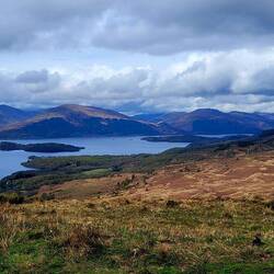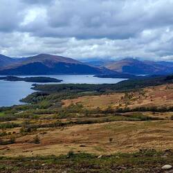 We walked steadily uphill for quite a while in the rain, the first section was all uphill before becoming an undulating and winding path leading to the bottom of Conic Hill, mispronounced and now forever known as colonic hill. It was a lot steeper than we thought it would be, It started with some steep steps and continued steeply uphill on very stony, broken, and uneven ground. I soon got a sense of how unfit I had become, having lazily done no hiking since returning from my last camino. It was exhausting, I think everyone was feeling it, especially Chris, he started falling further and further behind (we later found out that he had about 3-4 kilos of water in his backpack which wasn't needed and didn't help). I felt that if I stopped I might not get started again, so I had to keep going, and before long I had lost sight of everyone else. When I got to the top, the views were spectacular.