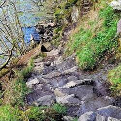 We had been told that the second half of the stage was more difficult but as we all set off together, it didn't seem too bad...it did not take long for that to change. The path became very rough, and uneven, it was more a scramble up over rocks or down over rocks. I don't think we took more than a few steps forward without having to climb up or down something. At times it was very unclear as to where the 'path' actually was. I am not sure how long that difficult part was, but I found myself way ahead of the others and arrived at the end of the Loch, where the path became much smoother and level. In my view, they should spend the money relaying a new path or diverting it somehow, there was not a single joyful step on that part, not one.