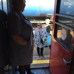 Our carriage provodnista in her cleaning smock and a local lady selling smoked Omul (fish from Baikal) to the passengers while we stopped for 2 minutes.