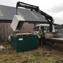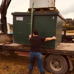 Just before 2pm Ron and his son turned up and were a sight for sore eyes. They had a tip trailer and a winch to remove the 12ft solid post hole driver. They knew exactly what they were doing and didn’t even need at help for the first time today so we watched as they managed to lever this huge piece of equipment into place, secure it and happily drive it away- great job done.
