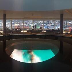 During a hot shower I rinsed the salt water from my wet clothes so they would dry properly and hung them dripping in the bathroom. After finding some dry clothes neither of us felt like a sit down breakfast so we went and got a cuppa and some takeaway fruit and went up to the Observation Lounge on the 7th deck.