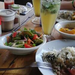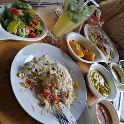 Jedli sva riž Palau z dvema prilogama, avakado solato in Orange Mojiho vsaka. Skupaj ca. 30$