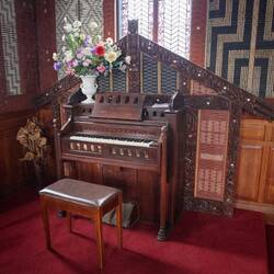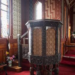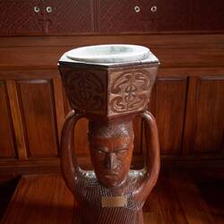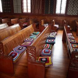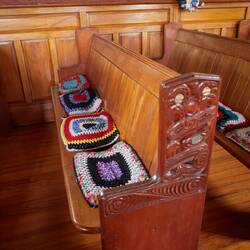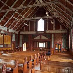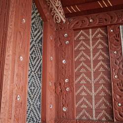 Nous retrouvons beaucoup de Tiki sculptés en bois, des décors et vitraux avec des motifs maoris rouges et noirs.