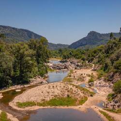 Meinen Pfad muss ich mir selber trampeln, die borstigen Sträucher und Kräuter hatten dem wohl einiges entgegenzusetzen. Oben angekommen bietet sich mir ein Ausblick, der Belohnung genug ist: Herrliches Morgenlicht taucht die Gegend mit Fluss, Bergen und viel Grün in pures Läuferglück. Volle drei Minuten sauge ich den Anblick in mich auf, mache obligatorische Handyfotos und befrage erneut das Komoot-Orakel. Der Weg – also eine wegartige Linie, die da in der Karte verzeichnet ist – würde mich direkt über die Klippe führen. Lieber nicht. Ich eiere noch etwas um die ungefähre Fährte des Weges herum, finde ihn allerdings nicht. Also den ganzen Quatsch wieder zurück. Und runter ist immer blöder als hoch. So viel steht fest. Der erste Sturz lässt auch nicht lange auf sich warten, zwei oder drei kommen noch dazu, denn das Geröll hier rutscht gern tückisch unter meinen Füßen weg. Mein Hintern fängt mich zuverlässig auf. Trotzdem fühle ich mich wie ein Held, als ich zerschunden und zerkratzt am Campingplatz eintreffe.