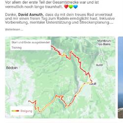 Für David steht fest: Beim Anstieg wird nicht angehalten. Und so passiert es! Erst oben gibt es per Messenger Lebenszeichen, Bilder und auch einen kurzen Video-Anruf. Derweil haben Erik und ich natürlich ganz genau verfolgt, wie schnell sich der kleine grüne David-Punkt auf der gelb markierten Strecke fortbewegt. Tracking sei Dank. David ist happy und kann auch keine krassen Radeln-am-Limit-Geschichten zum Besten geben. Mit der Anweisung, bloß nicht irgendwelche Geschwindigkeitsrekorde während der Abfahrt in Angriff zu nehmen, macht er sich auf den Rückweg. Schlappe 3 h und 33 mins kostet ihn der ganze Spaß. Als Genussfahrer habe ich mir 20 km mehr und insgesamt 5h und 18 mins gegönnt.