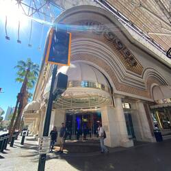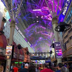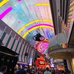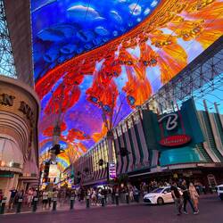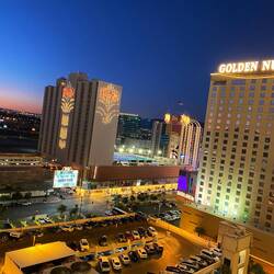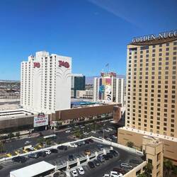 Das Hotel ist durch den berühmten Goldklumpen (engl. „Golden Nugget“) Hand of Faith bekannt geworden. Es war das erste Hotel, das von Beginn an auch als Casino konzipiert wurde. Im Inneren ist ein Poolbereich mit Haifischbecken. Besonders daran ist, dass man über eine Wasserrutsche durch einen durchsichtigen PVC-Kanal direkt durch das Haifischbecken rutscht, was wir aber nicht ausprobiert haben. Wir sind dann direkt aus dem Hotel und haben uns auf der Freeman Street amüsiert mit den alten Schildern und Leuchtreklamen und einer Aura von melancholischem Charme. Außerdem kann man hier Straßenshows, das Neon-Museum und die Fremont Street Experience besuchen, eine kostenlose Multimediashow, die jeden Abend auf dem Dach des Gebäudes gezeigt wird, das die größte Leinwand der Welt besitzt.