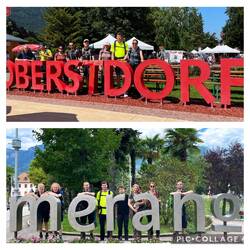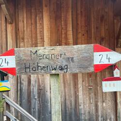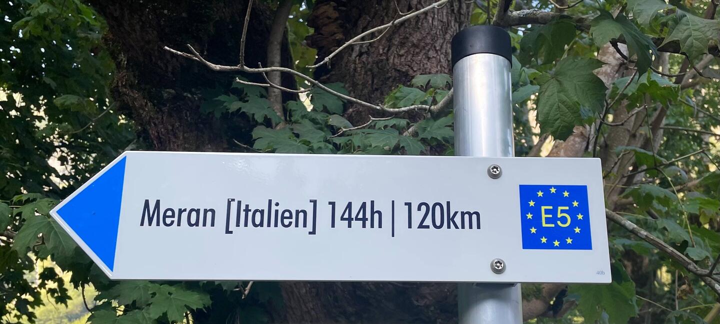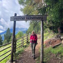 Unsere letzte Etappe steht heute an! Nach einem letzten Starterselfie von Luis machen wir uns bei leichtem Nieselregen um 7.50 Uhr auf den Weg! Heute steht uns eine lange Tour mit einem letzten forderndem Abstieg bevor. Haben wir aber schon zwei mal geschafft, schaffen wir auch ein drittes Mal! Die 400 Höhenmeter hoch kommen gefühlt alle am Anfang der Strecke. Uns wird es schnell warm und wir entledigen uns der Regenjacken. Das Landschaftsbild ist zunächst wie am Tag zuvor: schattige, felsige und moosige Waldpfade, Wiesen mit kleinen Höfen, Almen und Kühen. Heute haben wir aufgrund der Wetterbesserung einen guten Blick ins Tal. Meran, die zweitgrößte Stadt Südtirols, rückt immer mehr ins Blickfeld. Nach einer allerletzten Einkehr in eine Jausenstation verlieren wir rasch an Höhe. Irgendwo spuckt eine Kabinenbahn Wanderer in rauen Mengen aus und der Betrieb auf dem Meraner Höhenweg nimmt dermaßen zu, dass wir uns direkt wieder nach der Einsamkeit der Berge sehnen! Weiter geht der Abstieg über steinige Untergründe, durch Apfelplantagen und zum Schluss durch ein kleines Weinanbaugebiet. Es wird zunehmend mediterraner. Wir kommen im Dorf Tirol an und füllen ein letztes Mal die Trinkflaschen am Dorfbrunnen auf. Jetzt sind es nur noch drei km bis zum Schriftzug „Meran“, der das selbstdefinierte Ziel unserer Reise ist. Die Jungs, die wie immer schneller als wir waren, warten dort auf uns. Felix kommt auch hinzu und die Tramily ist wieder vereint. Bei Sonja und mir fließen die Tränen, wir haben es tatsächlich geschafft! Zu Fuß über die Alpen, von Oberstdorf nach Meran, durch drei Länder, 200 km, 10.000 HM rauf und 10.000 HM runter. Ungefähr. Ohne Hilfsmittel! Nach einem Finishergetränk checken wir ins Youth Hostel Meran ein, wo wir erst mal eine erfrischende Dusche genießen. Abends geht’s zu Sonjas Geburtstagsessen in eine Pizzeria. Happy Birthday, liebe Sonja ❤️! Heute haben wir unsere Vision von 2019 umgesetzt!