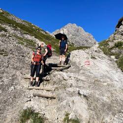 Die Memminger Hütte war voll belegt. Sogar im Trockenraum und im Winterlager haben Wanderer geschlafen. Dementsprechend groß ist der Trubel. Wir lassen die Bergsportschulen zuerst ziehen, frühstücken relativ spät und machen uns dann entspannt auf den Weg. Am unteren Seewiessee vorbei machen wir uns auf den Weg zur Seescharte auf 2599m, einem Spalt zwischen dem Seeschartenkopf und der Seeschartenspitze. Sie ermöglicht den Übergang vom Lechtal ins Inntal und wurde bereits in der Steinzeit genutzt. Es wird steil, geröllig und felsig. Ein letzter Blick geht zurück Richtung Hütte, die nur noch wie ein Modellbauhaus wirkt. Ist das schön hier! In einiger Entfernung können wir drei Gemsen beobachten. Hochkonzentriert meistern wir die steilsten Stellen hoch und runter, nicht ohne das einige von uns auf dem Hosenboden landen. Vor der markanten Silberspitze erfolgt mal wieder eine Fotosession. Danach erfolgt der lange Abstieg über insgesamt 1800 Höhenmeter, die jeder in seinem Tempo geht, immer begleitet vom Lochbach. An der unteren Lochalm legen wir eine Trinkpause ein und füllen unser Wasser auf. Die Wegführung des E5 läuft jetzt durch einen „Märchenwald“, der so verwunschen wirkt, dass man sich nicht wundern würde, wenn Kobolde um die Ecke kommen würden. Am Ende des Abstiegs ist unser Hotel schon in Sichtweite. Blöd nur, dass die Autobahnbaustelle die Querung der Autobahn unmöglich macht. Daher laufen wir bis zur nächsten Unterführung noch einem Umweg von 2,3 km. Wir checken im Hotel ein, gönnen uns ein Finishergetränk und genießen die erfrischende Dusche, das phantastische Essen sowie das weiche Bett. Wüssten wir noch nicht, was die vielzitierte Senkung der Glücksschwelle bedeutet, hier in den Bergen lernt man es garantiert.もっと詳しく