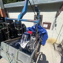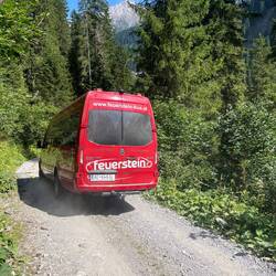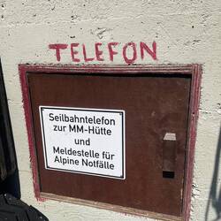 Wir starten in Bach mit dem Ziel, die ungefähr 11 km durchs Madautal vor der Mittagshitze zu schaffen. Hier führt unser Weg durch einen noch halbwegs intakten Kiefernwald. Der Bus des Taxi Feuersteins, das einzige Unternehmen, dass eine Lizenz fürs Madautal hat, begegnet uns mehrere Male. Vor sechs Jahren saßen wir auch da drin. Es fühlt sich gut an, zu Fuß unterwegs zu sein! Um 12 Uhr erreichen wir den imposanten Seekogel, an dessen Fuß wir mit Hilfe eines Kurbeltelefons auf der Memminger Hütte anrufen können, um unseren Gepäcktransport klarzumachen. Der Lastenwagen der Materialseilbahn wird rasch mit unseren Rucksäcken beladen.