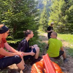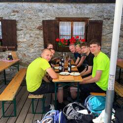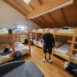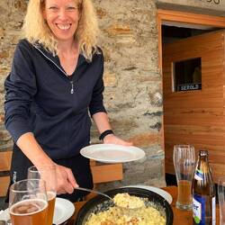 sind dank Jack als Pacemaker und musikalischer Unterhaltung mittels Schlager bestens den Berg hochgekommen, und zwar nur über die steilen Pfade. Respekt! Gemeinsam machen wir uns auf den Weg zur Larcher Alm. Diese ist unfassbar urig, und verfügt insgesamt über nur zwölf Schlafplätze. Wir haben Glück und haben diese für uns ganz alleine. Bald darauf haben alle Tagesgäste die Alm verlassen und wir sind mit den Besitzern alleine dort. Zum Abendessen gibt es Nudelsuppe und einen großen Topf köstliche Käsespätzle mit dem Rahm der eigenen Kuh. Lediglich Luis, der Käse hasst, isst seine Würstchen am Nachbartisch, weil er den Käsegeruch nicht ertragen kann🤣! Der „Almhund“ liegt vor unserer Tischgruppe im Kies und döst! Evi bringt uns noch ein tolles neues Spiel bei, aber außer Felix kann sich keiner mehr so recht konzentrieren. Wir beschließen, das Spiel am Pausentag intensiver zu erlernen. Um 22:00 Uhr liegen alle in ihren Betten und tanken Kraft für die letzte Etappe vor dem Pausentag!Read more