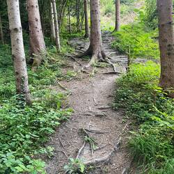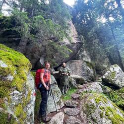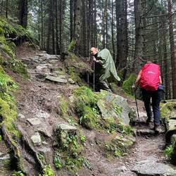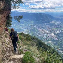 Auf diesen geht es jetzt für die anderen sieben Mitglieder unserer Tramily. Der Meraner Höhenweg ist noch viel schöner als erwartet. Der Wald ist hier sehr felsig und moosig, die durchgängig vorhandenen Singletrails sind teilweise ausgesetzt. Leider ist es sehr neblig. Bei klarer Sicht würden sich wundervolle Blicke ins Tal ergeben. Die heutige Etappe zeichnet sich durch ihr stetiges Auf und Ab und die markanten Steighilfen am Weg aus. Hier haben die Erbauer des Meraner Höhenweges besonders gute Arbeit geleistet und die Einschnitte, Täler und Steilstufen mit Brücken, Stufen und Sicherungen versehen. Die " Schlucht der 1000 Stufen" hat ihren Namen mehr als verdient Es regnet immer wieder, gegen Mittag wird der Regen stärker. Vor uns taucht bei km 9 der Linthof auf, ein Berggasthof, in den wir gerne einkehren Er bietet uns eine phantastische Mittagsverpflegung. Wir stärken uns mit Apfelstrudel, Kaiserschmarrn, Dreierlei vom Knödel und hausgemachten Nudeln! Irgendwann wird es klarer und wir können ab und an einen Blick ins Tal erhaschen. Wir sehen Naturns mit seinen zahlreichen Apfelplantagen und werfen noch einmal einen Blick zurück auf schneebedeckte Berge. Irgendwann entdecken wir im Tal Algund und die Ausläufer von Meran! Unfassbar, jetzt ist unser Ziel schon so nah!