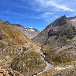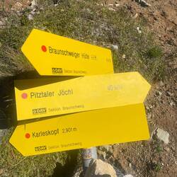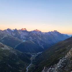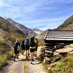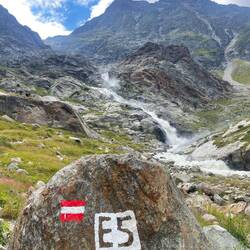 Wieder einmal entscheiden wir, die Bergsportschulen ziehen zu lassen und uns für Bergverhältnisse spät auf den Weg zu machen. Um 7 Uhr sind wir zum Frühstücken verabredet, danach wird gepackt. Wie bereits erwähnt, nutzen Moritz und ich den Morgen noch dazu, den Gipfel des Karlesberg zu besteigen. Es ist noch niemand draußen, als wir um 6 Uhr starten. Wir genießen die wunderbare Lichtstimmung des Sonnenaufgangs und dass wir die Bergwelt gerade mal für uns alleine haben. In 24 Minuten ist der Anstieg geschafft und wir erreichen das Gipfelkreuz. Wir saugen den Augenblick in uns auf und nehmen uns noch die Zeit, Gipfelfotos und Panoramabilder zu machen. Pünktlich um 7 Uhr sind wir zurück. Heute haben wir von der Hütte aus, die zwar am Ende des Pitztals liegt, aber bereits zu den Ötztaler Alpen gehört, zunächst einen einstündigen Anstieg aufs Pitztaler Jöchl auf 2996m zu machen. Die Sonne ist zurück und uns erwartet ein warmer Tag mit blauem Himmel. Auf dem Weg haben wir das große Glück zwei Steinböcke beobachten zu können. Einer grast ausgiebig, der andere spaziert gemächlich einen Wanderweg einige Meter unter uns entlang. Wir freuen uns riesig und Luis gelingt es, ihn zu filmen. Das Gelände des Pitztaler Jöchels ist, genau wie die Seescharte, technisch anspruchsvoll. Trittsicher und schwindelfrei sollten E5 Wanderer auf jeden Fall sein. Wie fordernd das Gelände ist, merkt man daran, dass wir für die ersten beiden km fast zwei Stunden benötigen. Nach einem kleinen Abstieg kommen wir im Skigebiet Sölden an. Nach einer kurzen Pause machen wir uns auf den Weg durch den Rosi-Mittermeier-Tunnel. Dieser ist ganze 2,3 km lang und führt uns steil ansteigend zum Tiefenbachferner. Hier beginnt der 4 stündige Panoramaweg nach Vent, ausgesetzt hoch oben am Hang entlang. Von weitem sehen wir auf der gegenüberliegenden Seite bereits den Similaungletscher, in dessen Richtung wir morgen unterwegs sind. Wir kommen in einer sehr skurrilen Pension unter, in der man aufpassen muss, sich nachts nicht zu erschrecken, wenn man auf Toilette geht!もっと詳しく