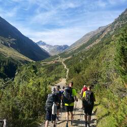 Erholt starten wir nach dem Pausentag durch die 2. Hälfte des Pitztals. Wir haben zunächst ca. 14 recht flache km, bevor wir zur Braunschweiger Hütte, unserem bisher höchsten Schlafplatz auf 2.759 m aufsteigen. Unterwegs versorgen wir uns in einem kleinen Lädchen mit Getränken und Lebensmitteln. Es gibt sogar einen Kaffeeautomat! Das letzte Örtchen im Pitztal ist Mittelberg. Nach diesem Ort ist auch der Gletscher oberhalb der Braunschweiger Hütte benannt, der Mittelbergferner Wir haben Glück, auch hier steht die Materialseilbahn für den Rucksacktransport bereit. Plötzlich rufen mich die Jungs… oberhalb sitzt auf einem Felsvorsprung ganz nah ein Murmeltier! Wie super süß! Wir packen die Tagesrucksäcke und laden die schweren Rucksäcke in die Seilbahn. Dass wir hier als eigentlich erfahrene Bergwanderer einen Anfängerfehler begehen, ahnen wir jetzt noch nicht. Es ist heiß und so nehmen wir zum Teil nur Fließjacken, teilweise auch gar keine Jacken mit. Nur Moritz und Evi haben Wind- und Regenjacke dabei! Wir beginnen mit dem Aufstieg zur Hütte über den Wasserfallweg. Hier stürzt sich zusammen mit dem Gletscherwasser des Mittelbergferners die Pitze tosend ins Tal. Zunächst hält sich das Wetter und wir genießen den wunderschönen Weg, der klettersteigartig und hochalpin anmutet. Leider zieht es sich bald zu, Nebel und Wind kommen auf. Als es dann noch anfängt zu regnen, wird es richtig ungemütlich….. wie dumm von uns, wissen wir doch, wie schnell das Wetter in den Bergen umschlagen kann! Ich bin echt glücklich, als alle wohlbehalten in der Hütte angekommen sind! Alle ziehen sich schnell trockene Klamotten an und wir versammeln uns im Gastraum, um heiße Suppen und Kaiserschmarren zu inhalieren! Jetzt kommt doch tatsächlich noch einmal die Sonne raus. Ich laufe schnell nach draußen und mache noch ein paar Bilder in der Sonne. Evi entdeckt sogar noch Steinböcke! Vor dem unfassbar leckeren Abendessen ruhen wir uns noch eine Weile auf dem Bett aus! Alle sind recht müde und wir gehen früh in unsere Vierbettzimmer. Morgen früh bin ich mit Moritz um 6:00 Uhr vor der Hütte verabredet. Wir wollen noch den Hausberg der Braunschweiger Hütte, den 2901m hohen Karlsberg vor dem Frühstück besteigen.もっと詳しく