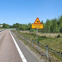 Auch die Tierwarntafeln hat es überall. Alle Wälder und Felder sind durch einen Zaun zur Autostrasse gesichert, trotzdem sahen wir immer wieder tote Tiere.