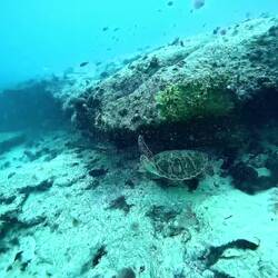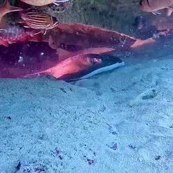 Einer von den besagten Stachelrochen kam uns nach einiger Zeit entgegengeschwommen. Er suchte sich einen Schlafplatz unter dem Wrack. Während ich meine GoPro unter das Wrackstück hielt um den Rochen zu filmen, konnte ich unser Glück kaum fassen. Der Rochen kam genau neben einem gut sichtbaren, ca. 2,5m großen Ammenhai zum schlafen. Hier verweilten wir eine ganze Weile, bis dass wir den Schiffsbug durchtauchten, um ein paar Muränen zu spotten.