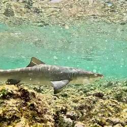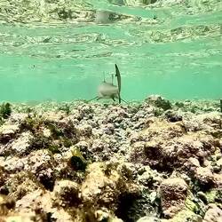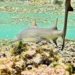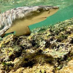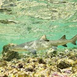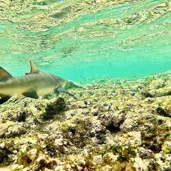 Dritter Stop: Shark Bay. Für mich das absolute Highlight und der Grund, warum ich diese Tour überhaupt machen wollte. In dieser Bucht ist das Wasser nur sehr flach. Vor vielen Jahren entdeckte man, dass hier junge Zitronenhaie aufwachsen, da sie in dieser Bucht genügend Nahrung finden und sicher vor ihren großen Rivalen sind. So konnten wir hier ins knietiefe Wasser steigen und wurden umschwirrt von vielen, neugierigen, kleinen Haien. Die größten waren maximal 1m groß. Besonders beeindruckt waren sie von meiner GoPro. Sobald ich sie ins Wasser hielt, kamen die kleinen Haie an, um zu erkunden, ob etwas nahrhaftes ins Wasser gefallen ist. Vielleicht kann ich bei den kommenden Tauchgängen auch mit der GoPro ihre Eltern anlocken?
