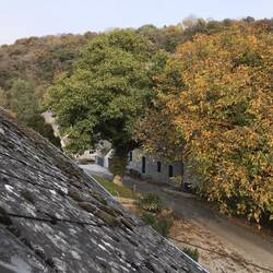 Then on our way to our B & B Hotel Franc Bois in Lompret. Nice owner with pooch Baloo, showed us our rooms - top floor of course with many stairs for M and B to drag our suitcases up to! Pleasant clean rooms - great breakfast next day - basic and a bit more as in all our stops. Every place we stayed in has stairs!! Jeakes House likely the steepest and narrowest. Off on a wee hike around the tiny village area - some dude climbing rock up and behind. Sat on church walls for a bit, just so enjoying the sun and air and Britt had fun clicking pics - so scenic an area.