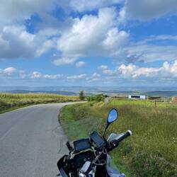 Auf den knappen vierhundert Kilometern gab uns der Regen immer wieder mal Verschnaufpausen. Sogar der Himmel wurde heller. Aber spätestens in diesem Moment steuerte die Streckenführung die nächste dunkle Wolke an, um zu testen, ob bei uns noch alles dicht war.