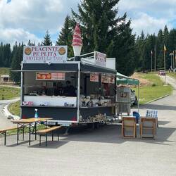 Auf der Südseite liegt ein langgestreckter Stausee, den man sehr kurvenreich 18 km weit auf einer im Wald gelegenen Straße entlang fährt. Hier begegneten wir vier an der Straße sitzenden oder liegenden Bären. Stets daran zu erkennen, dass Autos anhielten, um sich die Tiere anzusehen. Diese verharrten still in ihrer Pose und bewegten sich nicht von der Stelle. Wir fuhren den Empfehlungen entsprechend daran vorbei und verzichteten auf ein Fotoshooting. Leider, aber aus Vernunftgründen, denn sie sahen so putzig aus, auch eher klein, etwa einen Meter groß. Ab da ging es weiter wie in den Alpen oder Dolomiten, in Serpentinen über die Baumgrenze hinaus auf Passhöhe. Wobei der eigentliche Pass eine Tunnelunterquerung von etwa 800 Metern Länge des Gebirgskamms ist. Nach dem Tunnel folgte der Baleasee mit einer Hochfläche, die als Rummelplatz für unzählige Verkaufsstände (Essen und Souvenirs) genutzt wird. Daneben aber auch ein paar professionelle Gastronomiehütten, wie wir sie auch an solchen Orten kennen. Natürlich haben auch wir diesen Flecken zur Pause genutzt, ich für eine typisch rumänische Süßspeise: Papanasi, übersetzt mit traditional donuts with jam and sour cream. Lecker.