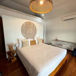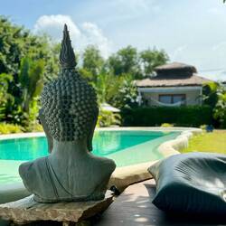 Auf Koh Phangan nahmen wir uns ein Taxi und fuhren zu unserer Unterkunft im Nordwesten der Insel. Was für ein super schönes Ressort. Es hat nur 5 Bungalows, die liebevoll eingerichtet sind und direkt am Strand liegen. Das kleine Boutique-Ressort ist bis 2026 (!!!) ausgebucht. Man findet ab und zu noch 2-3 freie Tage, aber es ist anscheinend sehr begehrt. Jetzt, wo wir da sind, wissen wir auch warum 🥰. Wirklich wunderschön und eine super gute Lage.
