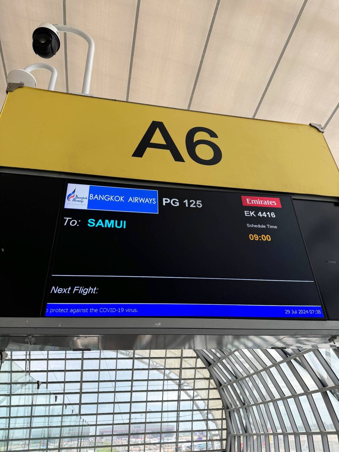 Um 5:30 Uhr klingelte der Wecker. Wir packten die restlichen Sachen zusammen und nahmen um 6 Uhr ein schnelles Frühstück ein. Dann ging es auch schon zum Flughafen von Bangkok, um nach Koh Samui zu fliegen. Es war nur ein kurzer Flug und dennoch geht ein halber Tag verloren (Anreise, Check-in, Boarding, Flug etc.). Auf Koh Samui organisierten wir dann die Tickets für das Wassertaxi; schliesslich wollten wir ja auf die Nachbarinsel Koh Phangan 🥰.