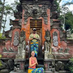 Im Resort gab es insgesamt acht solcher Bambushäuser. Die anderen Gäste sieht man aber kaum, da jeder zurückgezogen in seinem Häuschen lebt ☺️. Wir haben die Zeit sehr genossen und verschiedene Aktivitäten unternommen. Zum Beispiel haben wir balinesische Massagen und einen privaten Yogalehrer gebucht. Zwischendurch haben wir die Gegend zu Fuss erkundet. Ein absolutes Highlight war der Besuch eines Tempels. Dort haben wir ein spirituelles Healing und Ritual erleben dürfen, um gute und positive Energie sowie eine Art Reinigung zu erhalten. Das Ritual war eine tolle Erfahrung. Dass wir dabei so nass werden, war uns vorher jedoch nicht klar 😂🫣. Insgesamt ein tolles Erlebnis, das wir dringend empfehlen können.