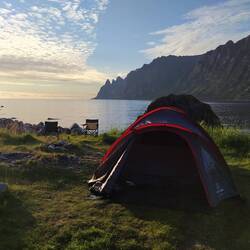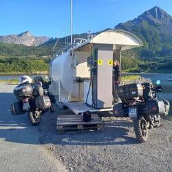 Morgens bei bestem Wetter aus'm Zelt in Saltstraumen gekrabbelt, total warm, zum Glück haben wir das Tarp aufgebaut, so hatten wir Schatten zum Kaffee 😉um 9:30 Uhr los zur Fähre in Bodo, hattenもっと詳しく