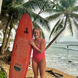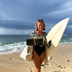 Später am Tag sind wir surfen gegangen. Das hat echt Spaß gemacht, aber ich habe Lillys Jubel ganz schön vermisst! Und dann, als wäre das nicht schon genug, habe ich meine ersten Wale gesehen – riesengroß! Wenn ich ehrlich bin, denke ich immer: Wenn da Wale und Delfine im Wasser sind, können die Haie ja nicht weit weg sein, oder? Vielleicht sollte ich einfach nicht weiter darüber nachdenken...
