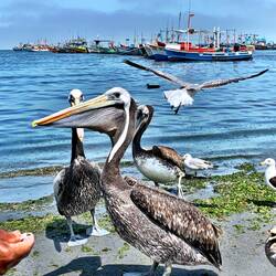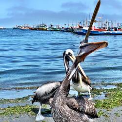 Heute morgen besuchen wir die Paracas-Halbinsel sowie die kleinen Ballestas Inseln, die wichtige Naturschutzgebiete an der Küste sind. Wir fahren wir mit einem 400 PS-Schnellboot dorthin. Man passiert mehrere alte russische Schiffwracks und erblickt an der Küste der Halbinsel den etwa 50 Meter langen so genannten Candelabro, ein Scharrbild im sandigen Boden, dessen Darstellung und Funktion noch ungeklärt sind. Im blassen Sonnenlicht tauchen die Inseln auf, majestätisch schwebende Pelikane und herab stürzen Guano – Tölpel, Grau - und Andenmöven, Inka – Seeschwalben mit ihrem schwarz - roten Federkleid und ihren weißen „Schnurrbart“, sowie die weißbrüstigen Guano - Kormorane erfüllen die Luft. Neugierig begleiten die Robben das Boot. Brüllende bis zu 10 Zentner schwere Seelöwen nutzen die Akustik der gewölbten Felswände, Humboldt – Pinguine watscheln mehr tollpatschig als elegant über die Klippen. Auf einer der unter Naturschutz stehenden Inseln erkennt man eine Guano – Fabrik mit Verladerampen und Förderbänder: 20.000 t Dünger aus Vogelmist exportiert Peru jährlich von den Inselklippen des Pazifiks in alle Welt.Read more