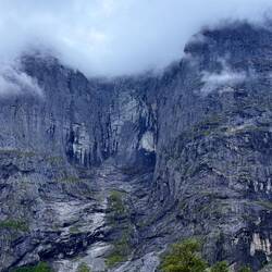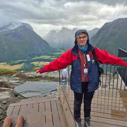 Ausgeschifft und eine schöne Bustour gemacht. Bei schönem Wetter wäre es vielleicht noch schöner geworden. Adlerstraße, Rondsdalen, Trollwand, Molde. Abendessen in 708 Meter Höhe.