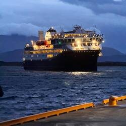 Das Schiff hält ja an vielen Häfen kurz an und lädt Ladung ein und aus. In Stokmarknes habe ich es nachts um 1:30 Uhr beobachtet.